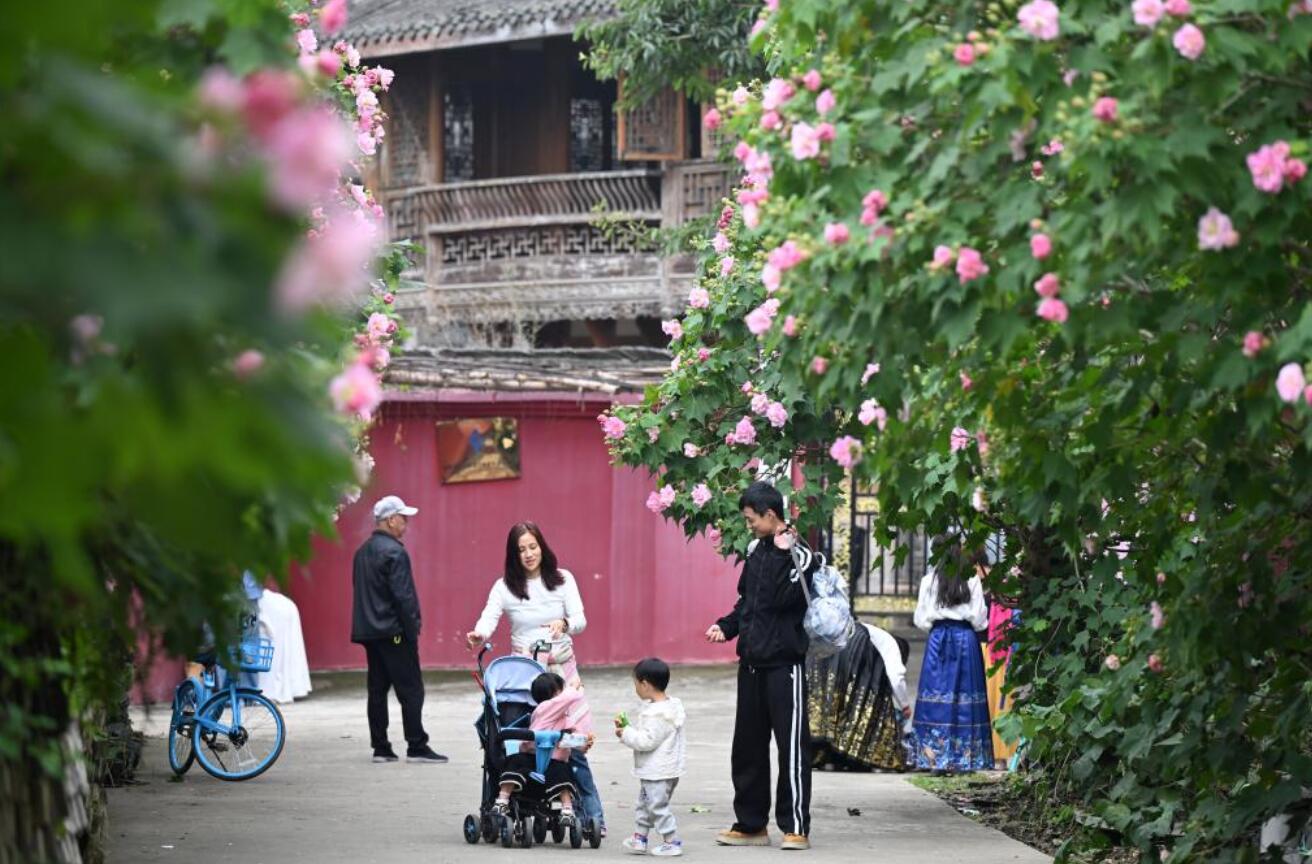 四川成都:芙蓉花扮靚紅墻黛瓦 市民打卡古風古韻景觀
